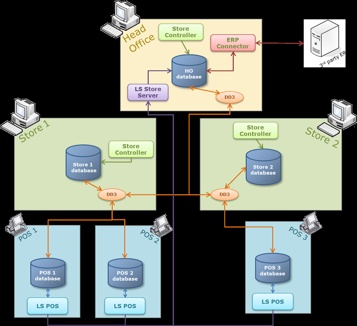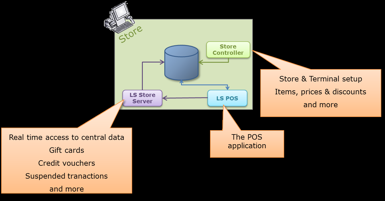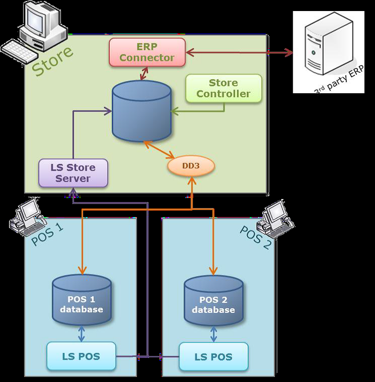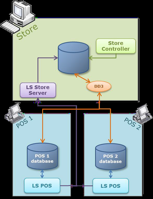 Когда Store Controller и LS POS настроены в off-line архитектуре, все данные стекаются из Store Controller – а в LS POS, а транзакции стекаются из POS-ов обратно в Store Controller с помощью репликатора Data Director. Кроме того, у POS-ов нет прямого доступа к данным Store Controller-а, для получения информации о запасах на складах ,в других магазинах, балансе покупателя и т.д. Преимущество этой конфигурации в том,что POS не зависит от Store Controller. В случае если сеть не работает, POS будет иметь возможность продавать, даже если он не может принимать информацию от Store Controller. А с другой стороны,это означает то ,что POS не получает информацию в режиме реального времени от Store Controller -а. Чтобы справиться с этим LS POS будут иметь доступ в базу данных Store Controller-а посредством LS Store Server-а, который предоставляет информацию в режиме реального времени POS-ам по требованию.